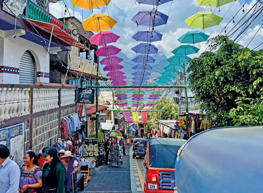Petit-déjeuner. Départ pour Chichicastenango, village à 2 000 m d’altitude, célèbre pour son marché coloré et traditionnel. Promenade à pied jusqu’à l’église Santo Tomás, où se mêlent rites chrétiens et mayas. Découverte des ruelles du marché et des artisans locaux : huipils, masques, objets en bois, argent ou faïence. Déjeuner du plat typique Quiché « Sak’Por », poulet préparé avec une sauce artisanale à base de maïs, l’ingrédient principal des guatémaltèques chez l´habitant, et de la boisson cérémonielle « la cusha », élaborée à partir de fruits fermentés et de rhum puis spectacle de la danse folklorique « danza de los moros ». Continuation en tuk-tuk vers le cimetière coloré du village, puis route vers Panajachel, ville touristique et culturelle du lac Atitlán. Installation à l’hôtel, dîner et nuit.